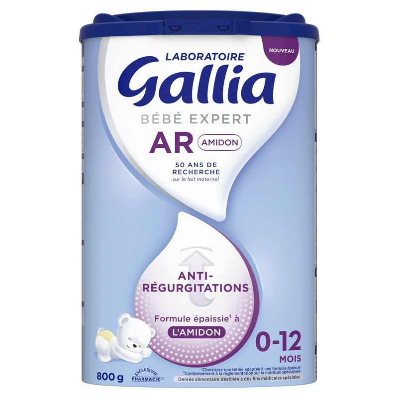 Gallia bébé expert AR lait 0-12 mois est formulé avec de l'amidon qui va permettre d'épaissir le lait. L'amidon n'épaissit qu'une fois dans l'estomac, et non dans le biberon.