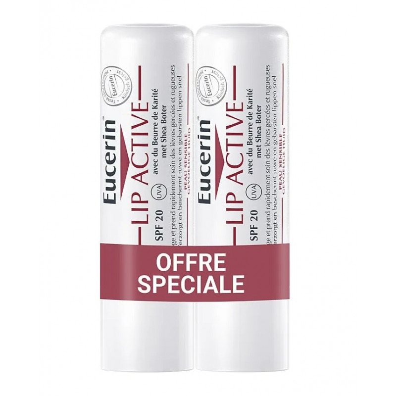 Le Soin Actif Lèvres Lip Active SPF20 d'Eucerin apaise et protège les lèvres sèches et sensibles. Lot de 2.