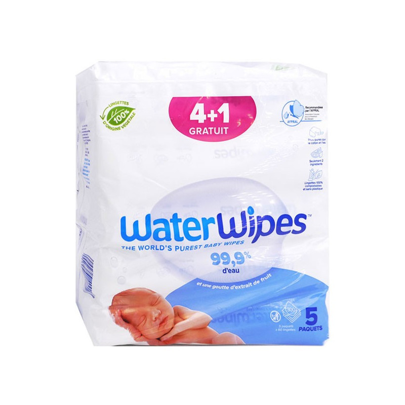 Waterwipes Lot de 4 x 60 Lingettes + 60 Lingettes Offertes sont des lingettes formulées à 99,9% d'eau et une goutte d'extrait de fruit.