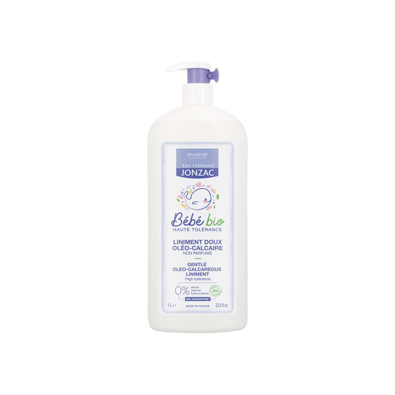Eau de Jonzac Bébé Bio Liniment Doux Oléo-Calcaire 1 Litre est un liniment à base d'eau thermale de Jonzac (10%) qui nettoie délicatement les fesses de bébé.