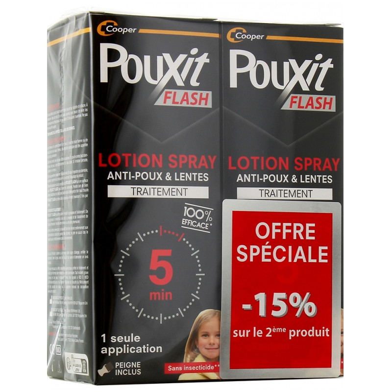 Pouxit Flash Anti-Poux et Lentes Spray Lot de 2 x 150 ml Offre Spéciale est une solution de traitement anti-poux et lentes, en une seule application cutanée.