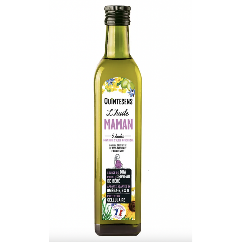 L’huile Maman Quintesens est une huile spécialement formulée pour répondre aux besoins des femmes enceintes, allaitantes ou en préparation à la maternité. Elle contient un mélange d'huiles riches en oméga-3, oméga-6 et oméga-9, des acides gras essentiels qui sont cruciaux pour la santé de la peau, mais aussi pour le bon fonctionnement du système cardiovasculaire et la réduction des inflammations.