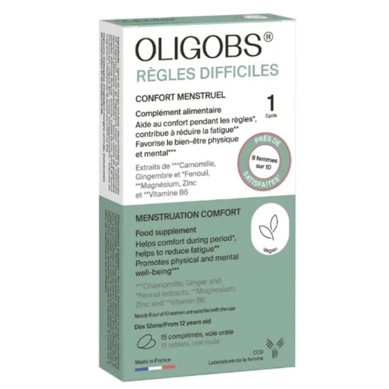 Oligobs Règles Difficiles du Laboratoire CCD est un complément alimentaire pour les femmes et les adolescentes à partir de 12 ans.