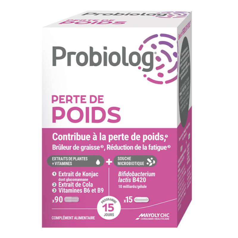 Probiolog® PERTE DE POIDS associe une souche microbiotique, des extraits de plantes et des vitamines : l’extrait de konjac apportant du glucomannane contribue à perdre du poids dans le cadre d’un régime hypocalorique, l’extrait de cola aide à brûler les graisses et les vitamines B6 et B9 contribuent à réduire la fatigue.