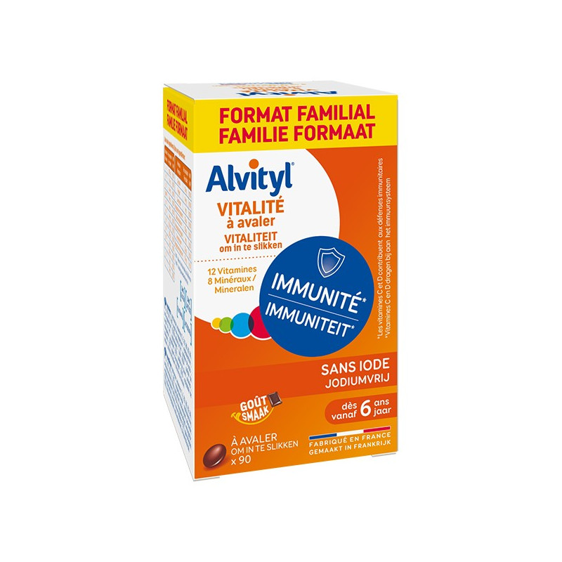 Alvityl® Vitalité à avaler est une association complète de 12 vitamines et 8 minéraux afin de couvrir 100% des apports de toute la famille dès 6 ans. Les comprimés saveur chocolat permettent de faciliter la prise des plus jeunes et des adultes.