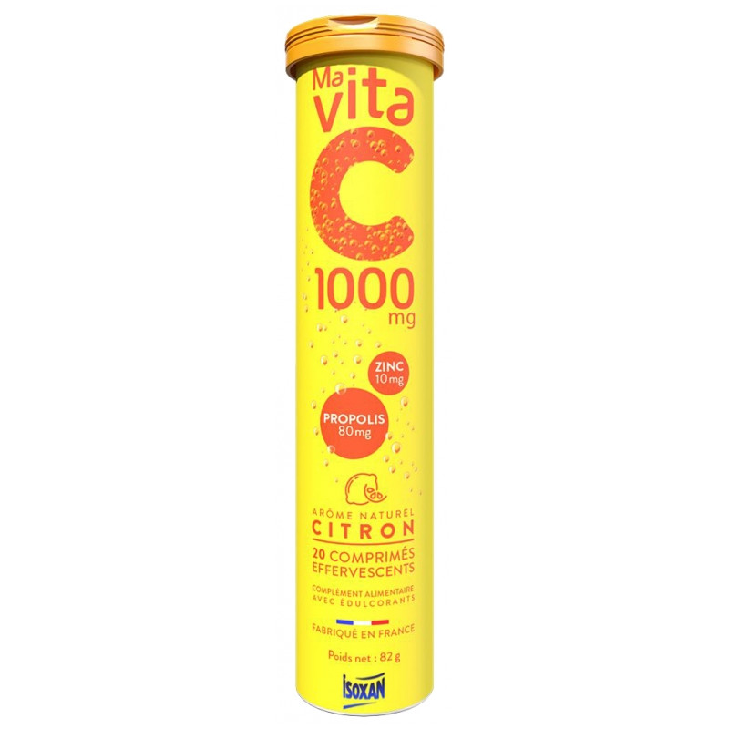 Isoxan Ma Vita C 1000 mg 20 Comprimés Effervescents est un complément alimentaire avec édulcorants qui contient de la vitamine C, de la propolis et du zinc.