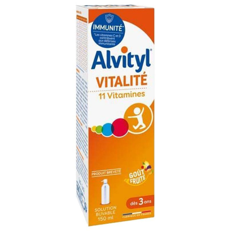 Alvityl Vitalité Solution Buvable 11 Vitamines 150 ml est un complément alimentaire sous forme de solution buvable dont la formule unique et brevetée associe 11 vitamines spécialement dosées pour couvrir 100% des valeurs nutritionnelles de référence pour : assurer à l'organisme forme et vitalité physique grâce aux vitamines B1, B3, B6, B8, B9 et C qui aident à réduire la fatigue, participer à la croissance osseuse grâce à la vitamine D. Sa forme liquide au bon goût fruité est particulièrement adaptée et appréciée par les jeunes enfants, et idéale pour les adultes ayant des difficultés de déglutition.