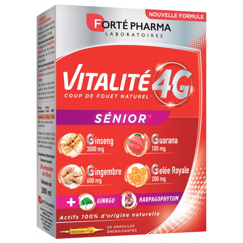 Forté Pharma Vitalité 4G Sénior 20 Ampoules vise à revitaliser naturellement l'organisme des seniors.