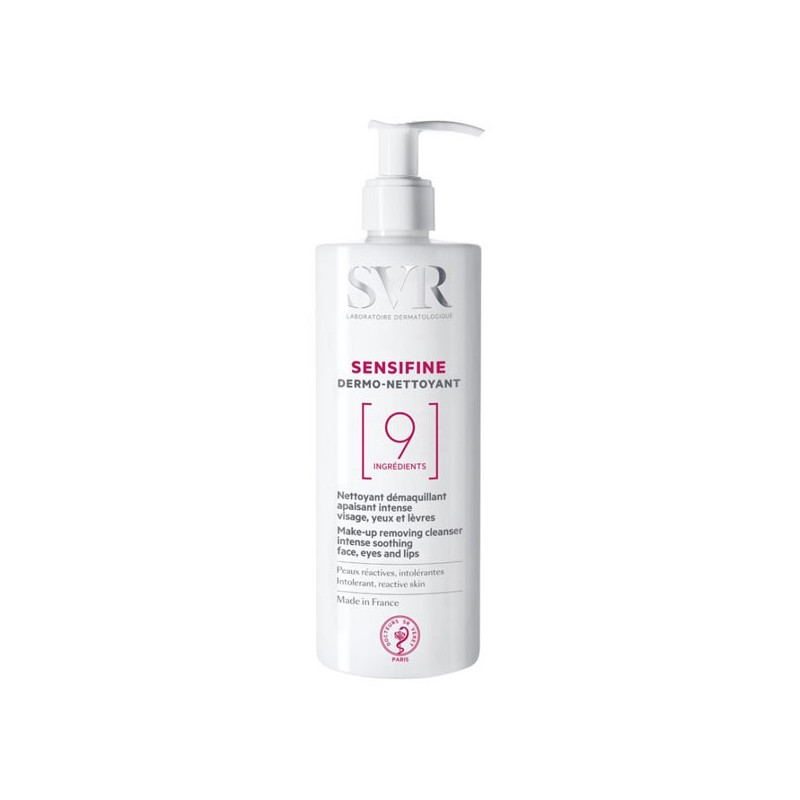 SVR Sensifine Dermo-Nettoyant Nettoyant Démaquillant 400 ml démaquille, nettoie et apaise intensément le visage, les yeux, les lèvres des peaux réactives intolérantes et hypersensibles.
