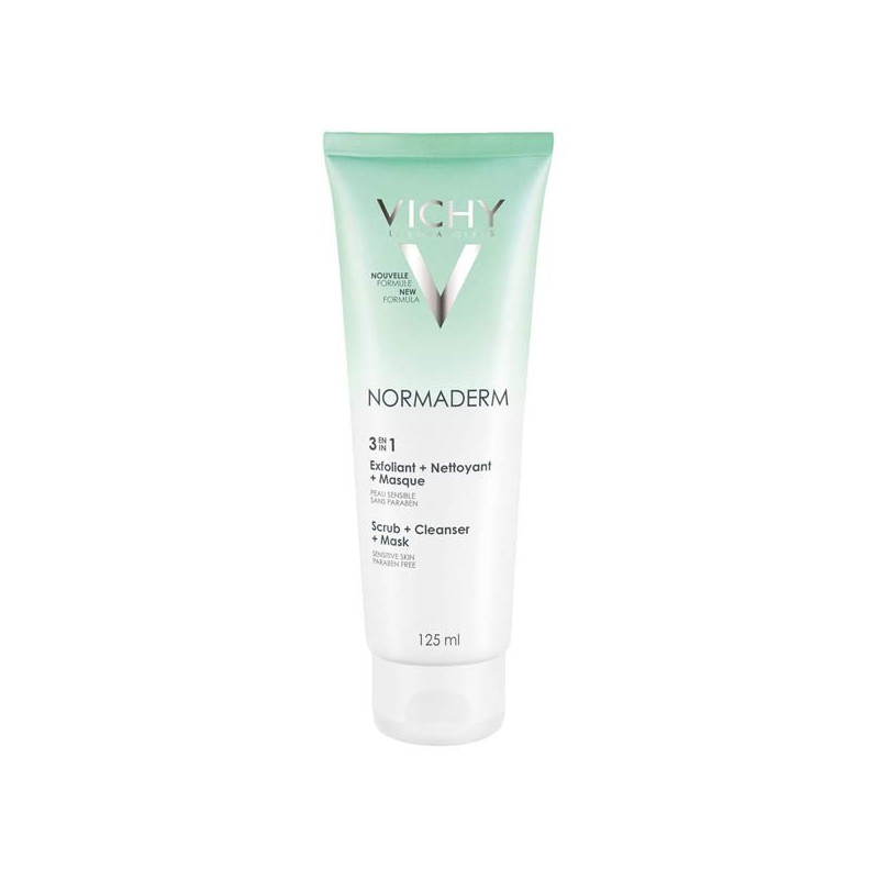 Normaderm nettoyant 3 en 1 des laboratoires Vichy est un soin nettoyant, exfoliant et masque pour une triple action pour les peaux sensibles à imperfections.