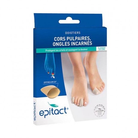 L’extrémité de l’orteil est une zone très sensible et lorsqu’il existe un conflit entre la chaussure et cette région du pied, les douleurs ressenties sont vives. C’est le cas si le bout du doigt de pied présente un cor ou des callosités, un ongle incarné ou s’il est soumis à une succession de traumatismes mécaniques (microchocs). Pour protéger la pulpe de l’orteil, le doigtier epitact® comporte du gel silicone breveté epithelium26® qui répartit les pressions et limite les agressions extérieures. Indispensable dans la boîte à pharmacie pour soulager et constituer un traitement pour les douleurs liées aux cors pulpaires, ongles bleus et ongles incarnés.