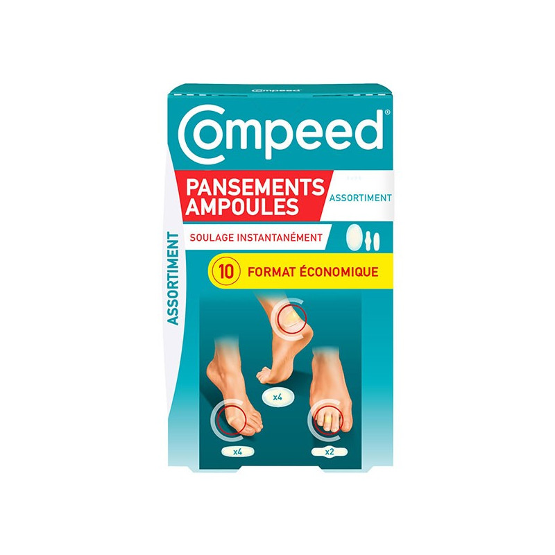 Compeed Ampoules Assortiments 10 Unités est un lot de pansements de trois formats différents qui permettent de soulager les ampoules sur les pieds.