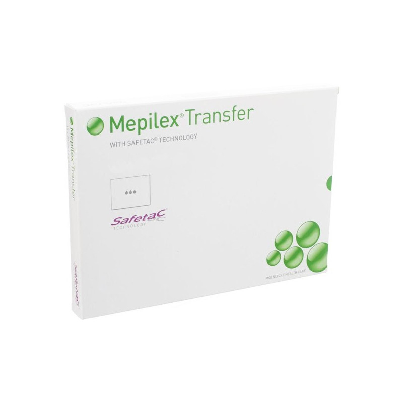 Molnlycke Health Care Mepilex Transfer Pansement Siliconé de Transfert des Exsudats 7,5 x 8,5cm 10 unités est utilisé dans la technique de la cicatrisation en milieu humide, à base de polyuréthane (= hydropolymère), matériau absorbant qui ne se gélifie pas, et de silicone.