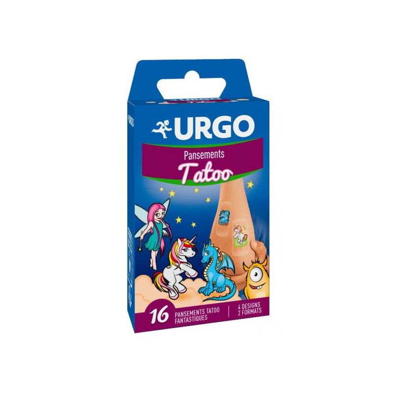 Urgo Pansements Tatoo 16 pansements protègent efficacement les plaies des enfants tout en les réconfortant grâce à leur design ludique.