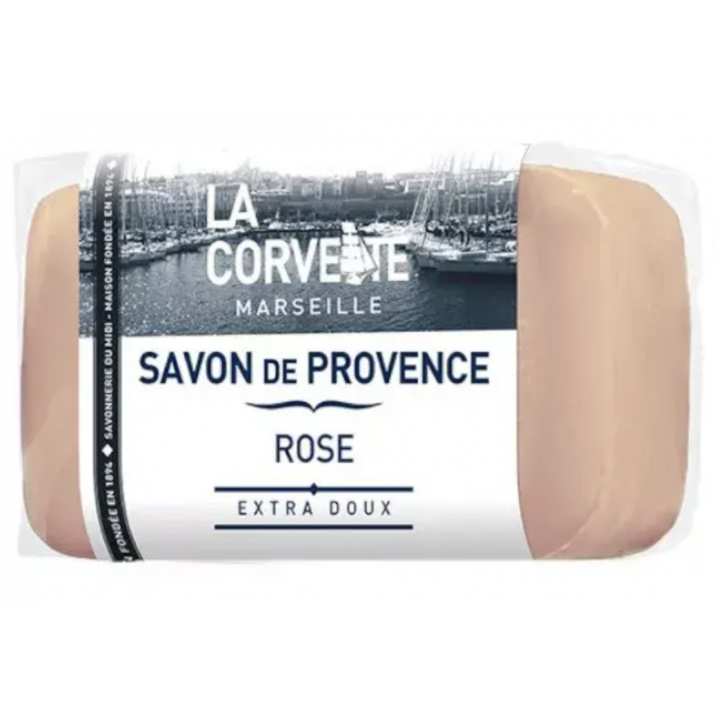 La Corvette Marseille Savon de Provence Rose Filmé 100g permet de nettoyer la peau en douceur et de l'adoucir grâce à sa formule enrichie en huiles végétales certifiées bio.
