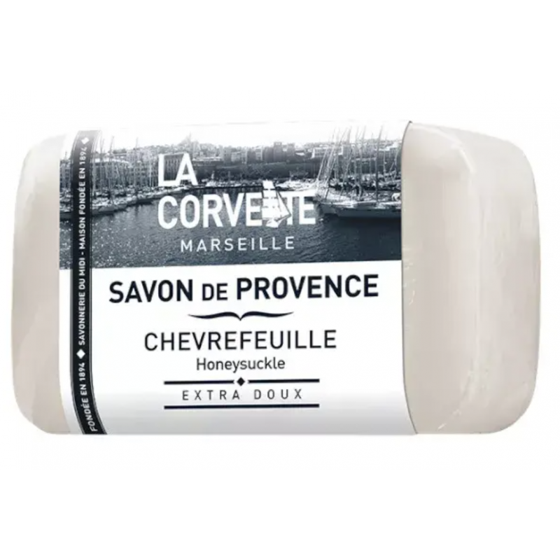 La Corvette Marseille Savon de Provence Chèvrefeuille Filmé 100g permet de nettoyer la peau en douceur et de l'adoucir grâce à sa formule enrichie en huiles végétales certifiées bio.