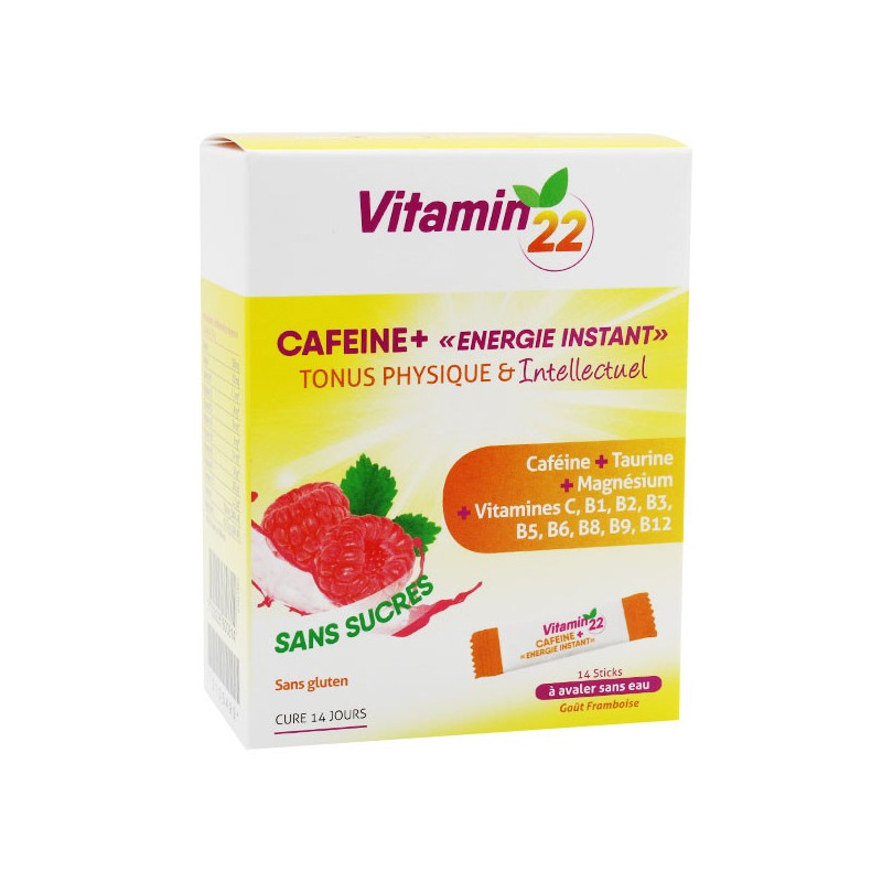 Vitamine 22 Caféine est un stick de poudre prêt à l'emploi, pour une utilisation facilité au quotidien. Il contient de nombreux actifs, notamment :