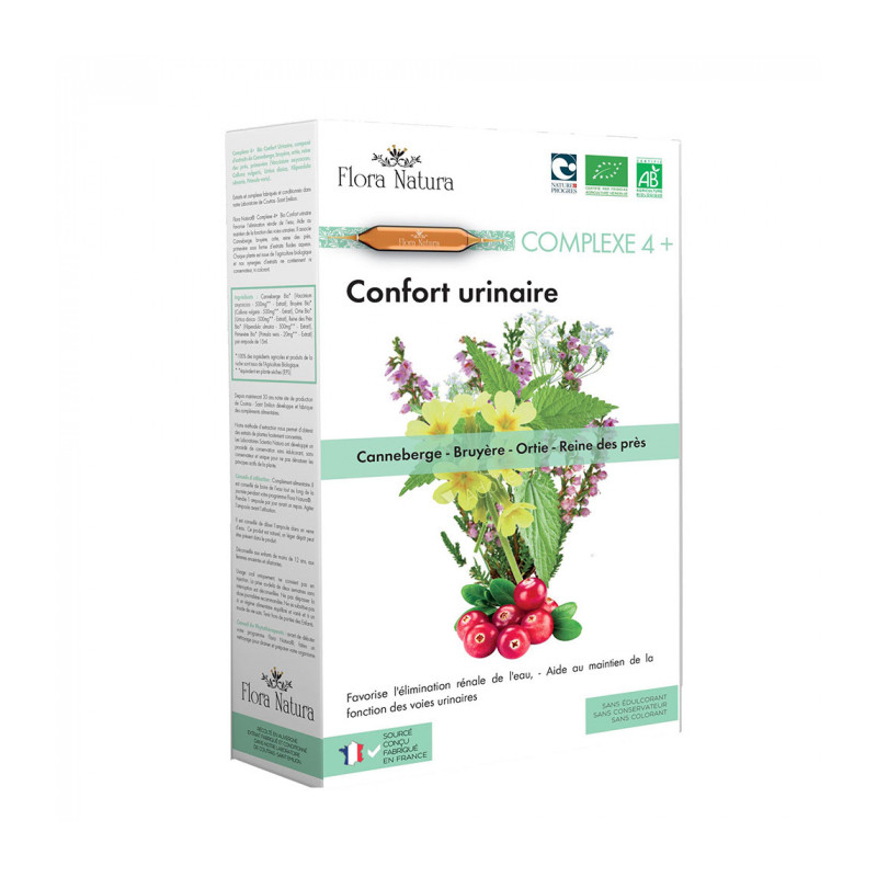 Flora Natura® Complexe 4+ Bio Confort urinaire Favorise l'élimination rénale de l'eau, Aide au maintien de la fonction des voies urinaires. Il associe Canneberge, bruyère, ortie, reine des près, primevère sous forme d’extraits fluides aqueux. Chaque plante est issue de l’agriculture biologique et nos synergies d’extraits ne contiennent ni conservateur, ni colorant.