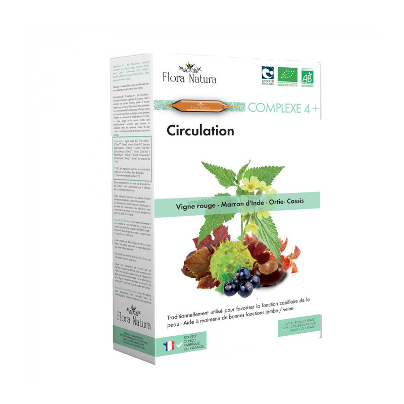 Flora Natura® Complexe 4+ Bio Circulation - Favorise la fonction capillaire de la peau, aide à maintenir de bonnes fonctions jambe. Il associe vigne rouge, marron d'Inde, ortie, Cassis , primevère sous forme d’extraits fluides aqueux. Chaque plante est issue de l’agriculture biologique et nos synergies d’extraits ne contiennent ni conservateur, ni colorant.