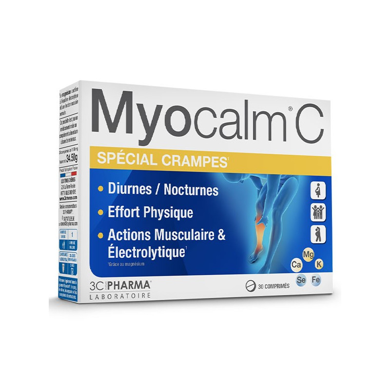 3C Pharma Myocalm C Spécial Crampes 30 Comprimés est un complément alimentaire sous forme de comprimés à base de magnésium qui contribue à l'équilibre électrolytique et à une fonction musculaire normale.