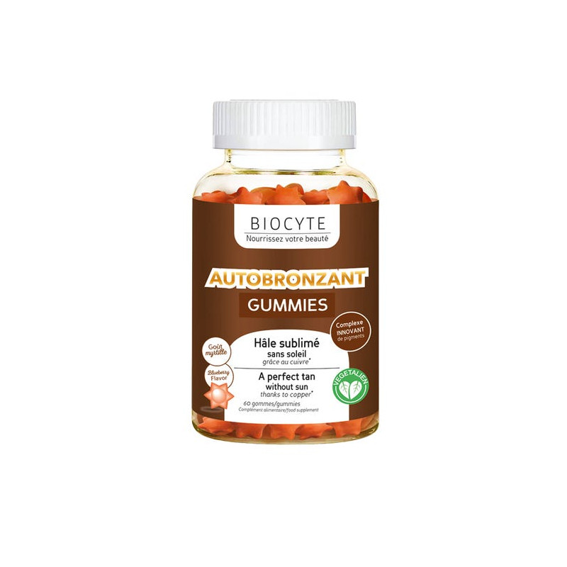 Autobronzant Gummies de Biocyte est un complément alimentaire sous forme de gomme à mâcher au bon goût de myrtille. Grâce à un complexe innovant, ces gummies subliment la peau en apportant progressivement un hâle naturel sans avoir besoin de soleil.
