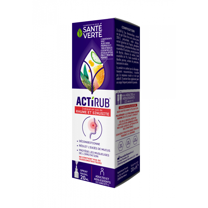 Santé Verte Actirub Spray Nasal 20ml est un dispositif médical décongestionnent qui réduit l'excès de mucus et facilite l'élimination des agents irritants.