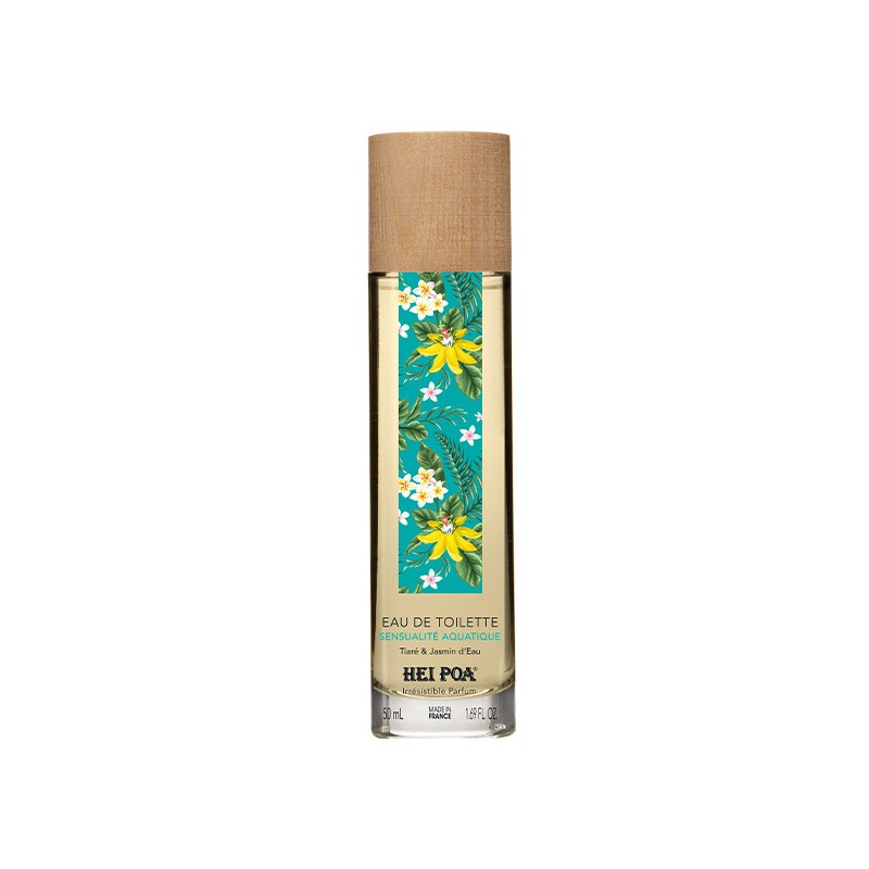 Hei Poa Eau de Toilette Sensualité Aquatique 50ml s’éveille sur un accord sucré et léger de mandarine, de mangue et de jasmin d’eau. La sensualité florale du frangipanier et des fleurs d’oranger vogue au cœur du lagon.