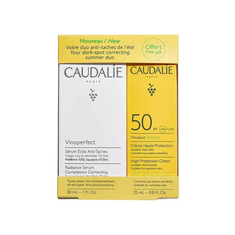 Vinosun Protect Crème Haute Protection SPF50 25 mL AQUA/WATER/EAU,DIBUTYLADIPATE,DIETHYLAMINOHYDROXYBENZOYLHEXYLBENZOATE,PROPANEDIOL,DICAPRYLYLCARBONATE,ETHYLHEXYLTRIAZONE,METHYLPROPANEDIOL,BISETHYLHEXYLOXYPHENOLMETHOXYPHENYLTRIAZINE,PHENYLBENZIMIDAZOLESULFONICACID,ARGININE,C20-22ALKYLPHOSPHATE,CRAMBEABYSSINICASEEDOIL,C20-22ALCOHOLS,BENZOTRIAZOLYLDODECYLP-CRESOL,POTASSIUMCETYLPHOSPHATE,PALMITOYLGRAPESEEDEXTRACT,BUTYROSPERMUMPARKII(SHEA)BUTTEREXTRACT,GLYCERIN,CAPRYLYLGLYCOL,CAPRYLYL/CAPRYLGLUCOSIDE,SILICA,XANTHANGUM,PHYTOSTEROLS,POLYACRYLATECROSSPOLYMER-6,PHENYLPROPANOL,O-CYMEN-5-OL,TOCOPHERYLACETATE,PICEAABIESWOODEXTRACT,LINALOOL,HEXYLCINNAMAL,HELIANTHUSANNUUS(SUNFLOWER)SEEDOIL,GERANIOL,TOCOPHEROL,PARFUM(FRAGRANCE),CITRONELLOL.(320/044) Vinoperfect Sérum Eclat Anti-Taches 30 mL AQUA/WATER/EAU, BUTYLENE GLYCOL, GLYCERIN, COCO-CAPRYLATE/CAPRATE, SQUALANE, PALMITOYL GRAPEVINE SHOOT EXTRACT, POLYGLYCERYL-3 DISTEARATE, BISABOLOL, GLYCERYL STEARATE, XANTHAN GUM, CAPRYLYL GLYCOL, MICROCRYSTALLINE CELLULOSE, POLYACRYLATE CROSSPOLYMER-6, POTASSIUM SORBATE, GLYCERYL STEARATE CITRATE, CITRIC ACID, SODIUM PHYTATE, SODIUM HYDROXIDE, PARFUM (FRAGRANCE) (243/032)