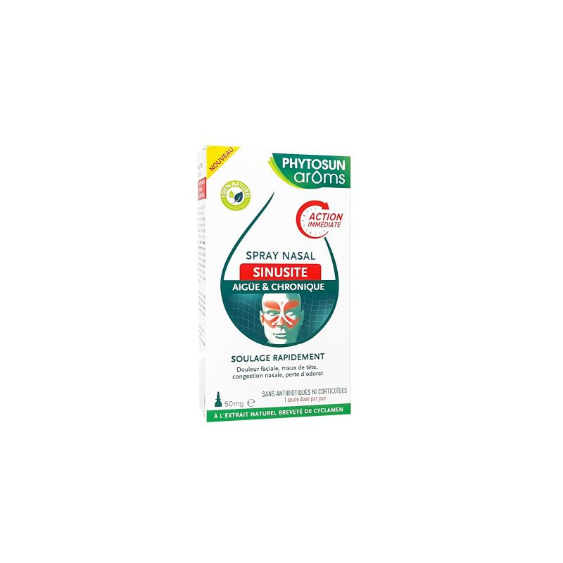 Le Spray nasal sinusite Phytosun Arôms est un dispositif médical 100% naturel recommandé en cas de sinusite chronique ou de sinusite aigüe. Cette solution aqueuse à l’extrait naturel breveté de cyclamen soulage le nez bouché, les sécrétions nasales, la perte de l’odorat et les douleurs faciales liées à la congestion.