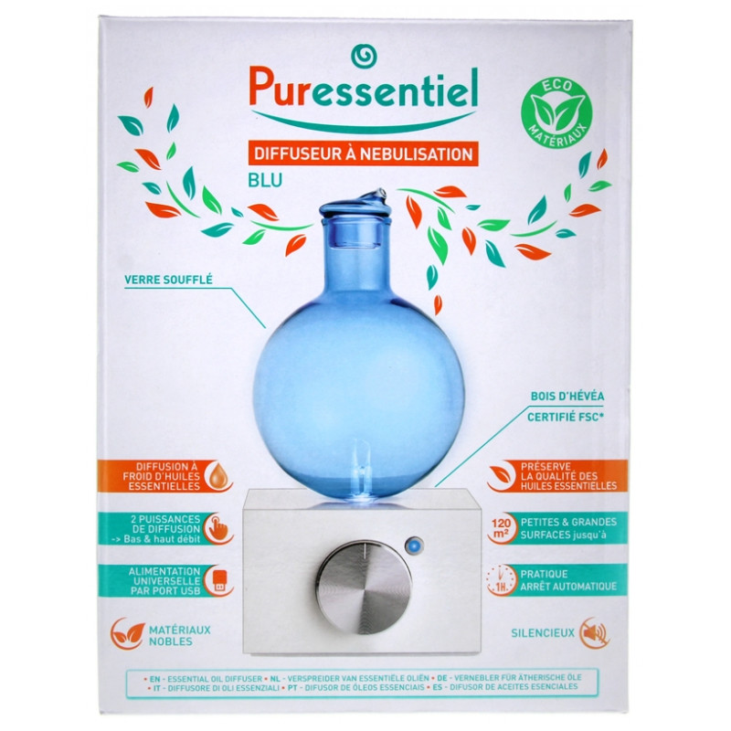 Puressentiel Diffuseur à Nébulisation BLU Edition limitée utilise le principe de la nébulisation : une diffusion d'huiles essentielles pures (sans eau) sous forme de très fines particules. Cette diffusion à froid, puissante et efficace, disperse les huiles essentielles sans les dénaturer préservant ainsi toutes leurs qualités et bienfaits.