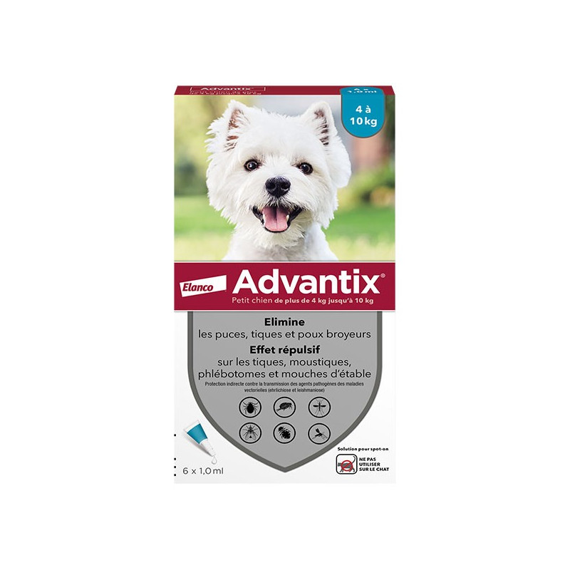 Advantix Chien Solution Antiparasitaire est un médicament vétérinaire sous forme de pipettes qui s'utilisent par application qui élimine les puces, tiques et poux broyeurs. Il a aussi un effet répulsif sur les tiques, moustiques, phlébotomes et mouches d'étable.