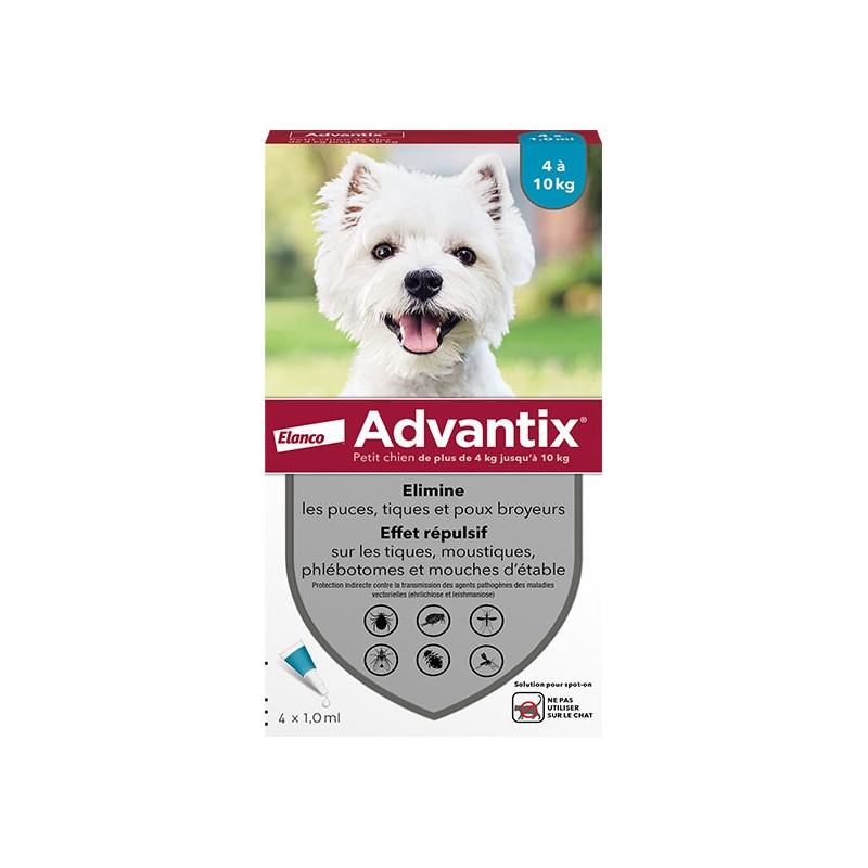 Advantix Chien Solution Antiparasitaire est un médicament vétérinaire sous forme de pipettes qui s'utilisent par application qui élimine les puces, tiques et poux broyeurs. Il a aussi un effet répulsif sur les tiques, moustiques, phlébotomes et mouches d'étable.