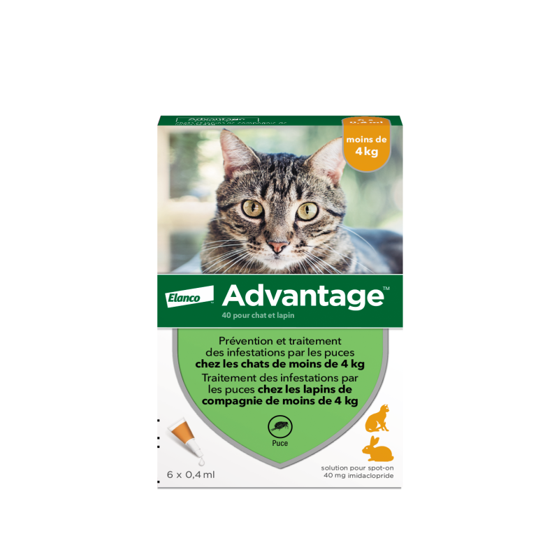 Les pipettes Advantage® sont recommandées par les vétérinaires. Les puces sont tuées un jour après le traitement. Un seul traitement prévient les ré infestations par les puces pendant 3 à 4 semaines chez le chat et jusqu’à une semaine chez les lapins. Le médicament peut être intégré dans un programme thérapeutique de la Dermatite Allergique par Piqûres de Puces (DAPP), après diagnostic par le vétérinaire.