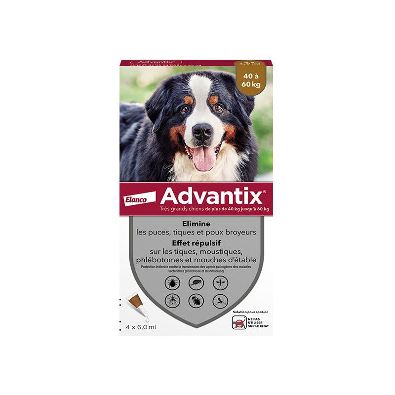 Advantix Chien Solution Antiparasitaire est un médicament vétérinaire sous forme de pipettes qui s'utilisent par application qui élimine les puces, tiques et poux broyeurs. Il a aussi un effet répulsif sur les tiques, moustiques, phlébotomes et mouches d'étable.