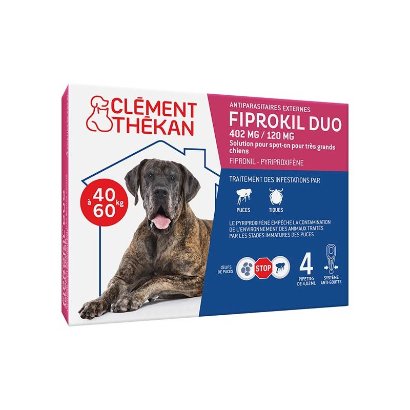Clement Thekan Fiprokil Duo Anti-Puces Anti-Tiques Chien 4 pipettes est un antiparasitaires à utiliser contre les infestations par les puces seules ou contre celles par les puces et par les tiques.
