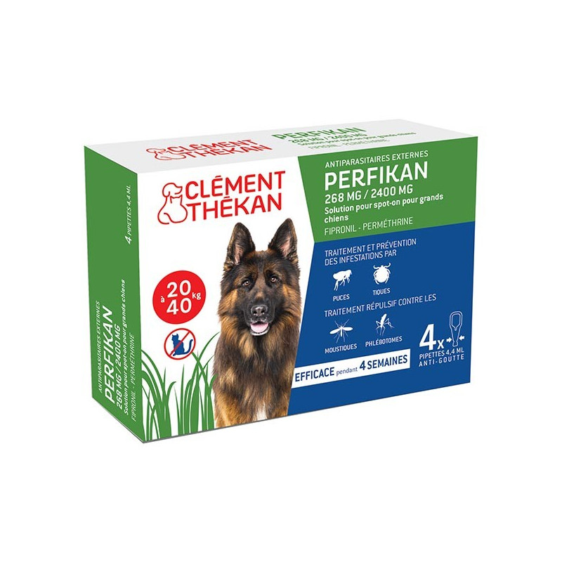 Clement Thekan Perfikan Anti-Puces Anti-Tiques Chien 4 pipettes est un antiparasitaires à utiliser lors d'infestations par les puces et/ou les tiques, lorsqu'une activité répulsive (anti-gorgement) contre les phlébotomes et/ou les moustiques est également nécessaire.
