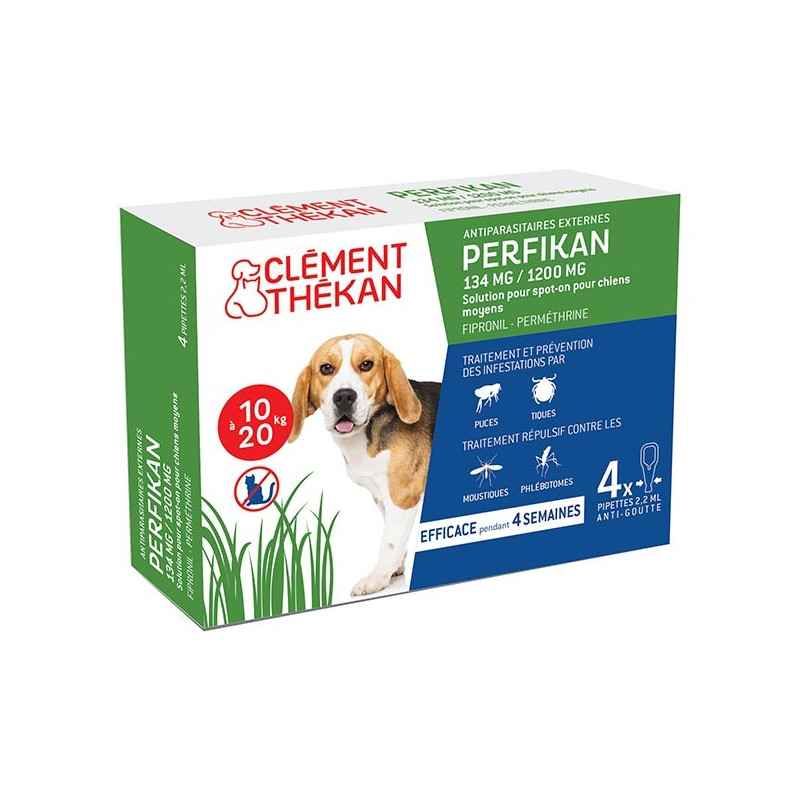 Clement Thekan Perfikan Anti-Puces Anti-Tiques Chien 4 pipettes est un antiparasitaires à utiliser lors d'infestations par les puces et/ou les tiques, lorsqu'une activité répulsive (anti-gorgement) contre les phlébotomes et/ou les moustiques est également nécessaire.