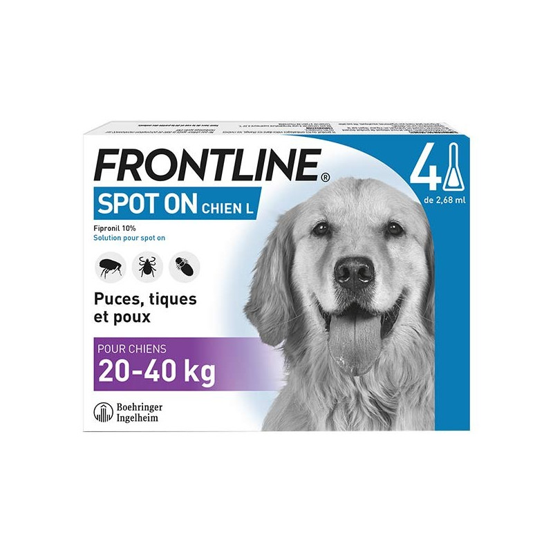 Frontline Spot On Chien L 4 pipettes est un traitement qui tue les puces et les tiques grâce au médicament déposé sur la peau de votre animal.
