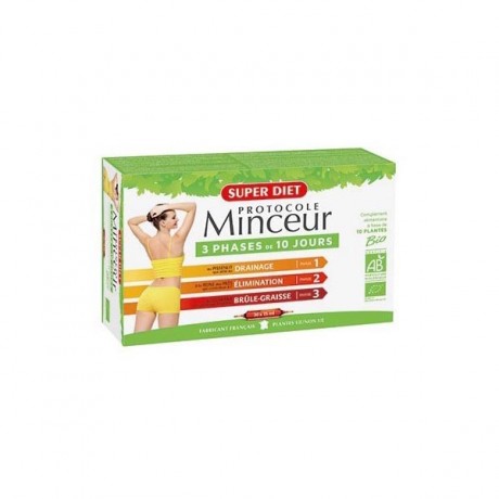 Protocole minceur est un programme de 30 jours se déroulant en 3 phases successives de 10 jours. Ces 3 complexes de plantes bio sont formulés selon les principes de la naturopathie à base de plantes sélectionnées pour vous par les laboratoires super diet.