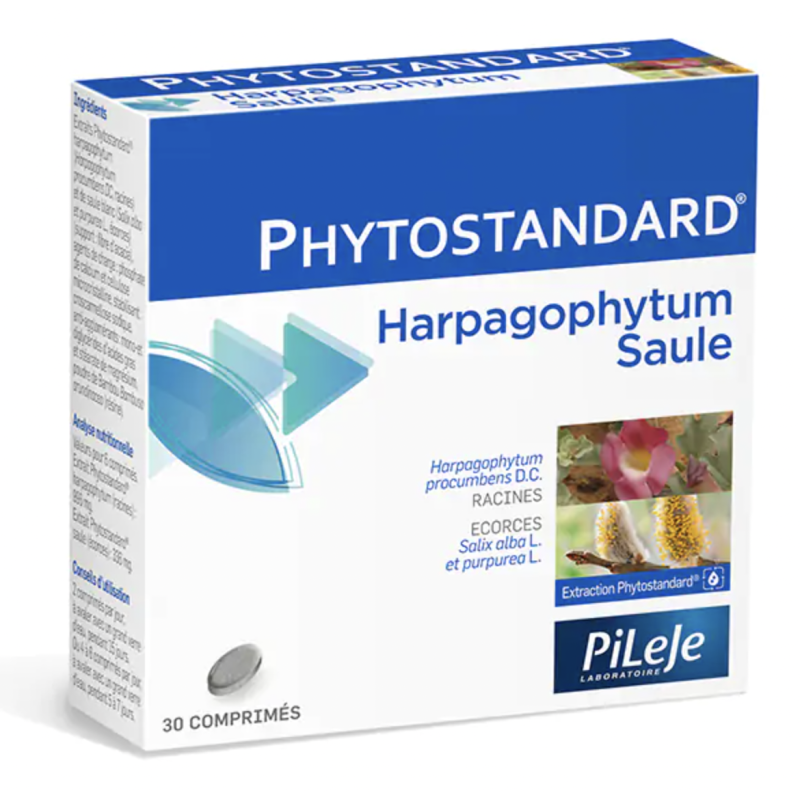 Pileje Phytostandard Harpagophytum Saule 30 Comprimés est un complément alimentaire à base d'extraits d'Harpagophytum (Harpagophytum procumbens DC.) et de Saule (Salix alba L et purpurea L.).