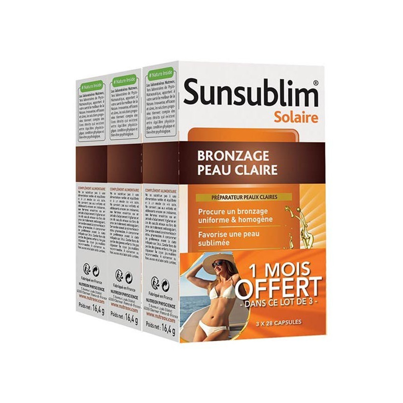 Nutreov Sunsublim Bronzage Peau Claire Lot de 3 x 28 Capsules aide à activer et à sublimer le bronzage tout en protégeant la peau des effets néfastes du soleil.