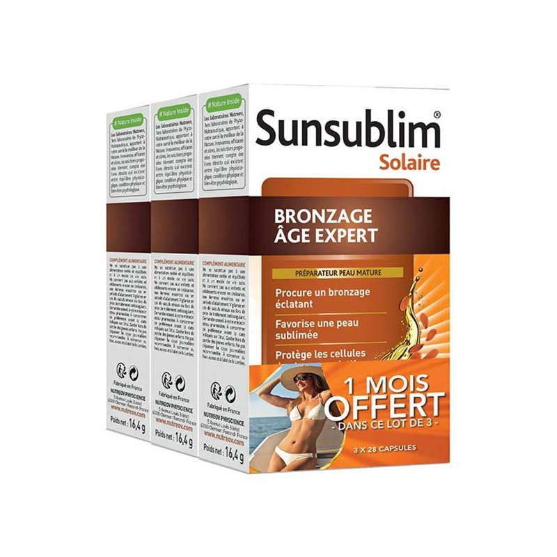 Nutreov Sunsublim Bronzage Âge Expert Lot de 3 x 28 Capsules est un complément alimentaire sous forme de capsules qui permet de préparer votre peau au bronzage.