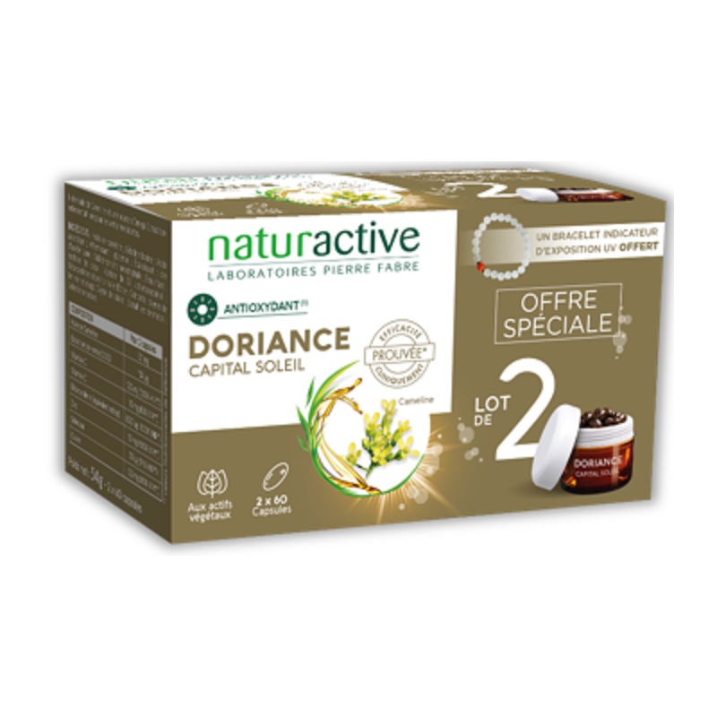 Naturactive Doriance capital Soleil Lot de 2 x 30 Capsules est un complément alimentaire sous forme de capsules à base de 7 phytopigments® d'origine végétale, sélectionnés pour donner une tonalité dorée et lumineuse à votre peau sous l'effet du soleil, pour ne plus choisir entre un hâle sublime et la santé de sa peau.