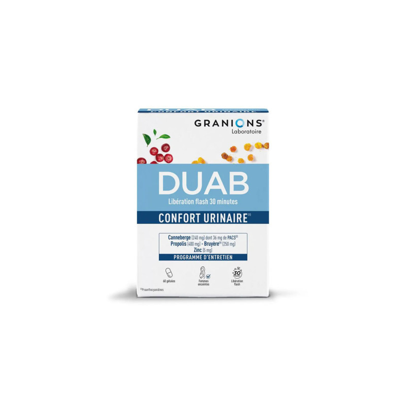 DUAB est une composition nutritionnelle originale, brevetée et développée avec un institut de recherche scientifique de renom. Cette composition associe deux ingrédients, un extrait de canneberge (Vaccinium macrocarpon) et de la propolis.