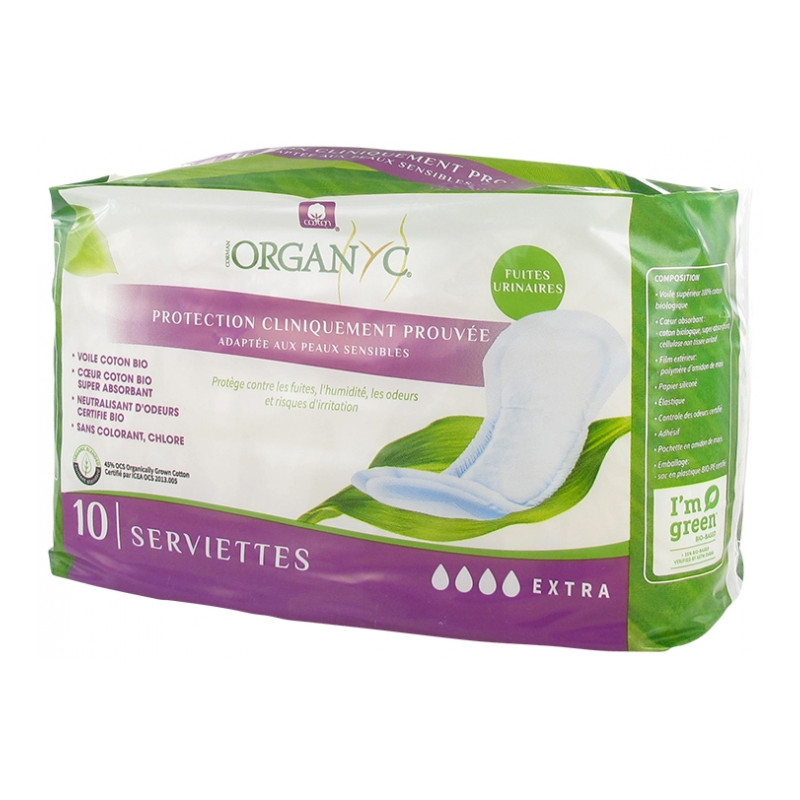 Organyc Fuites Urinaires Extra 10 Serviettes Bio sont des protections contre les fuites, l'humidité, les odeurs et risques d'irritation, adaptées aux peaux sensibles. Le format Extra est conçu pour les fuites abondantes.