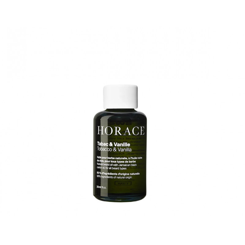 L'Huile à Barbe Tabac et Vanille Horace est une huile quotidienne qui nourrit et adoucit les poils de la barbe sans laisser de film gras.