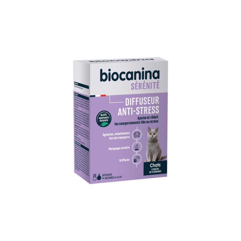 Biocanina Diffuseur Anti-Stress Chat 45 ml contient une recharge et un diffuseur. Le diffuseur anti-stress Biocanina diffuse une substance naturelle dans l'habitat connue pour ses propriétés apaisantes chez le chat.