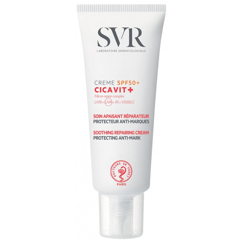 SVR Cicavit+ Crème SPF 50+ Soin Apaisant Réparateur Protecteur Anti-Marque 40 ml est une très haute protection qui apaise et accélère la réparation des peaux abîmées et en plus cible tous les types de rayons UVA, UVB, infrarouges et lumière visible. Ce soin convient au visage, au corps, aux plis, à bébé, à l'enfant, à l'adulte.