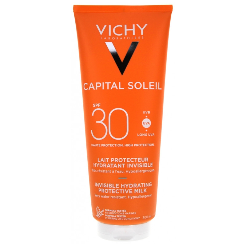 Vichy Capital Soleil Lait Protecteur SPF30 300 ml est un lait hydratant invisible qui offre une haute protection solaire pour le visage et le corps.