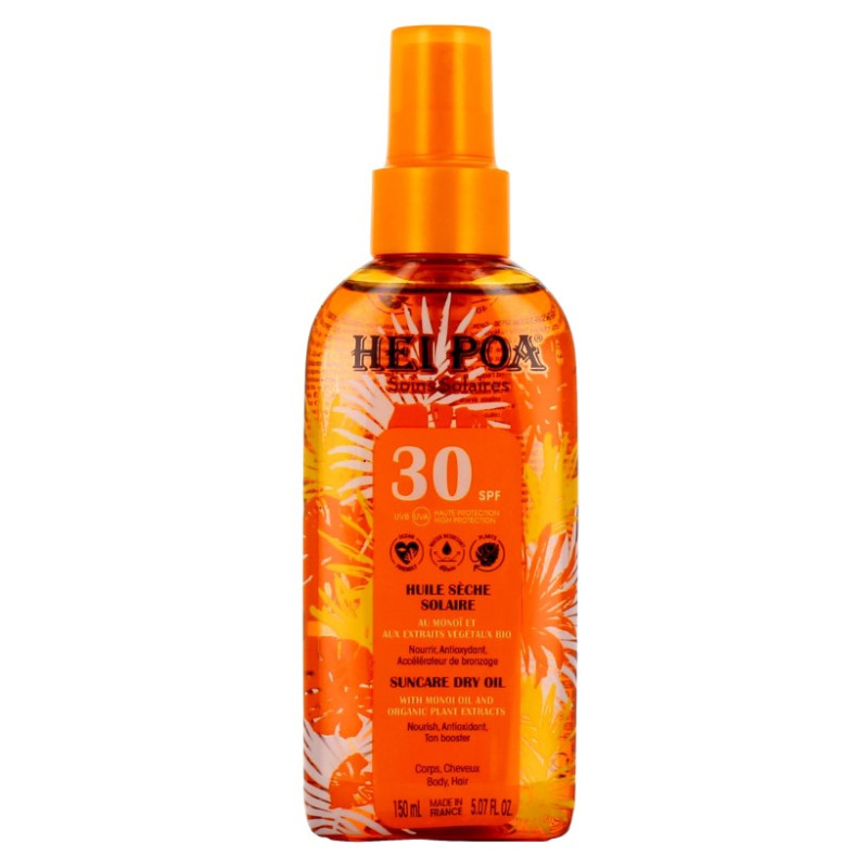 L'huile solaire Hei Poa possède les propriétés hydratantes et nourrissantes naturelles issues du Monoï, ingrédient phare de ce cosmétique. L'huile solaire sèche au Monoï Hei Poa apporte à votre peau un aspect satiné et pénètre immédiatement. Elle ne colle pas et résiste à l'eau.